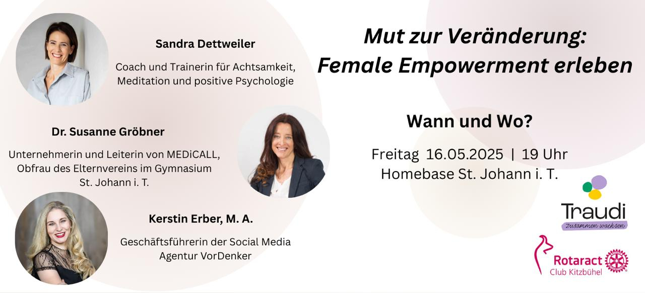 Homebase St. Johann in Tirol Kaiserstraße 29, St. JohannRAC x TrauDi: Ein Abend voller Inspiration, Austausch und neuen Perspektiven Manchmal sind es die Geschichten anderer, die uns den Mut geben, unseren eigenen Weg entschlossen zu gehen. Genau darum geht es bei der gemeinsamen Veranstaltung von Rotaract Kitzbühel und TRAUDI. Am 16. Mai 2025 öffnen wir die Türen der Homebase in St. Johann für […]